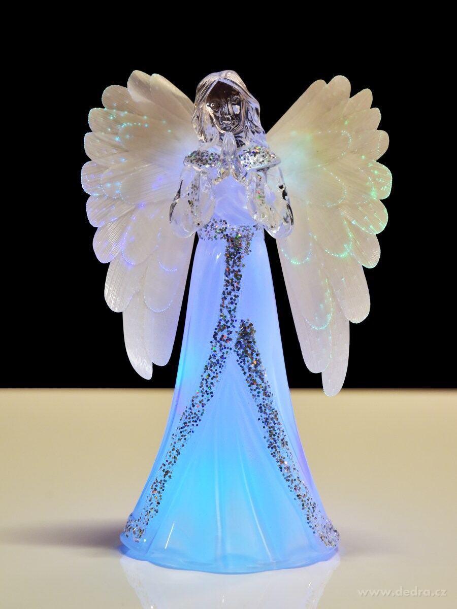 Svítící anděl s barevným LED osvětlením. Měnící se barevné LED osvětlení i na koncích křídel anděla.