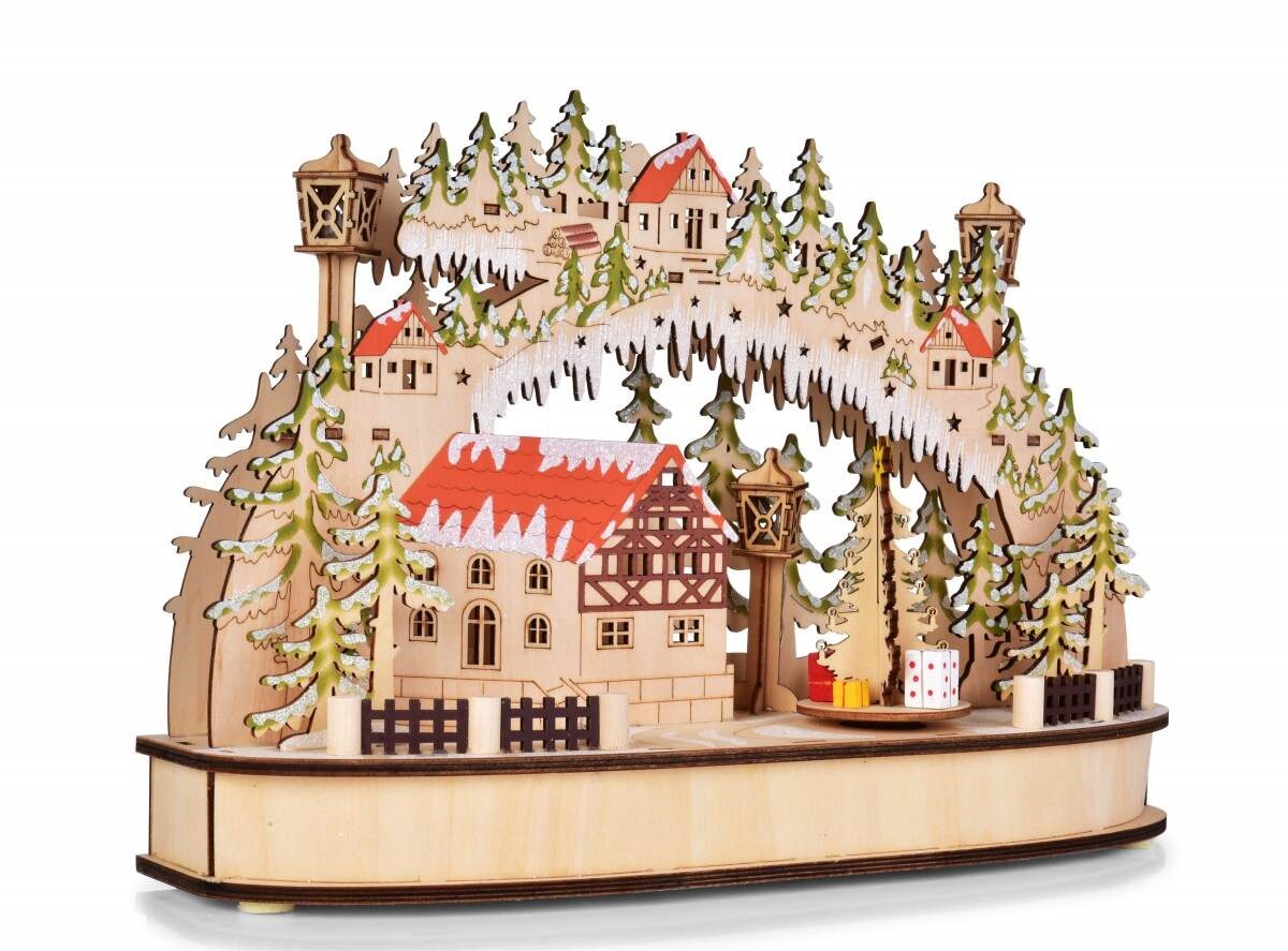 Dřevěná detailně propracovaná dekorace. Rozměry: š 35 x h 10 x v 23 cm. Napájení na 3 tužkové baterie 1,5 V AA (nejsou součástí balení)