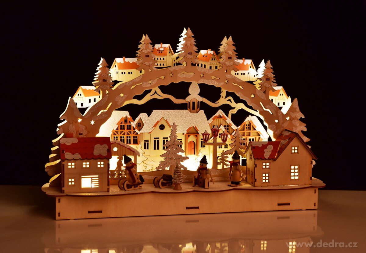 Dřevěná detailně propracovaná dekorace. Rozměry: š 45 x h 9 x v 28,5 cm. Napájení na 3 tužkové baterie 1,5 V AA (nejsou součást balení)