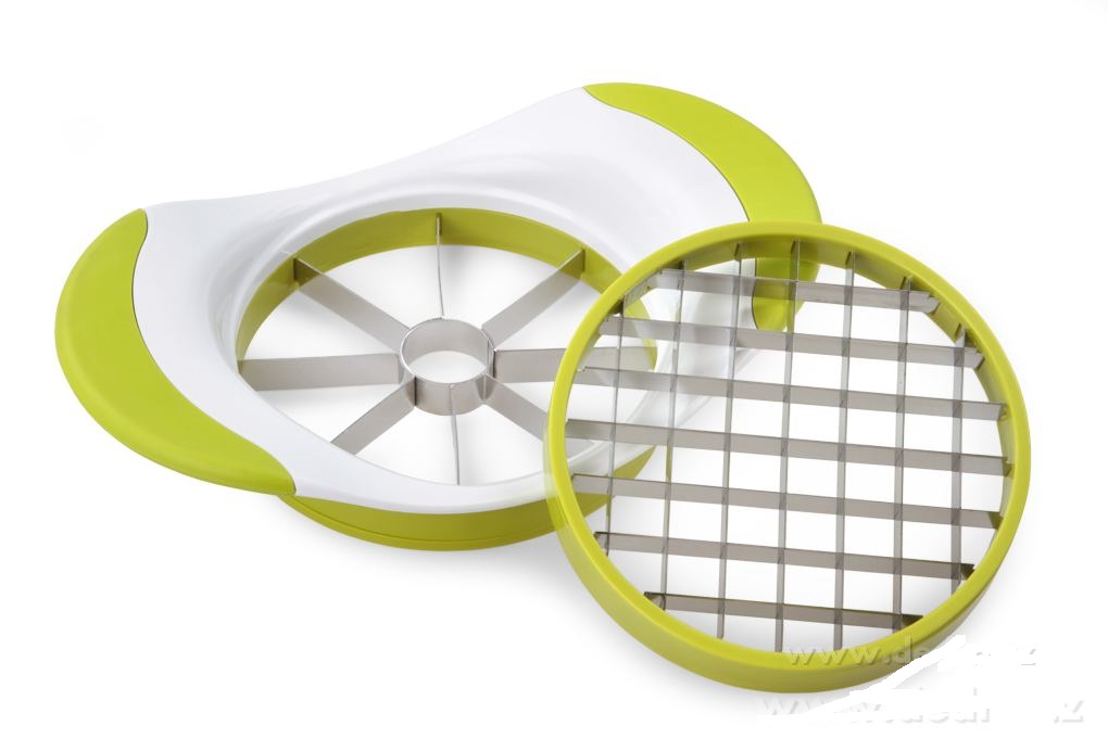 Materiál odolný plast s ABS soft touch držadly a kvalitní nerezová ocel. Výrobek se skládá ze ZÁKLADNY a DVOU VYMĚNITELNÝCH HLAVIC (na osminy + na hranolky: zeleninové, ovocné, bramborové).