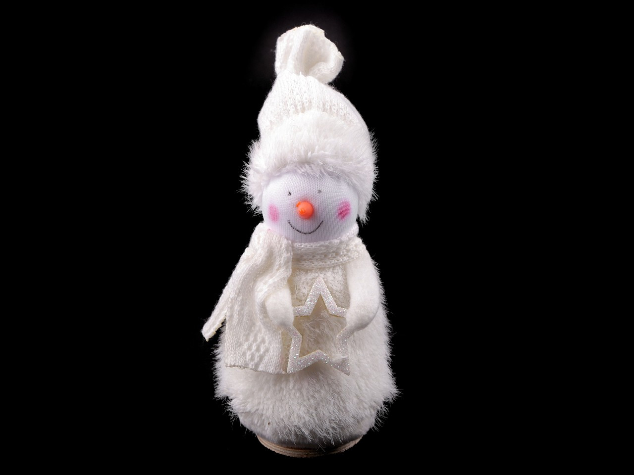 Plyšový sněhulák je milou zimní dekorací. Vyniká hravými detaily. Ve spodní části je dřevěný podstavec, díky kterému má postavička dobrou stabilitu.